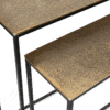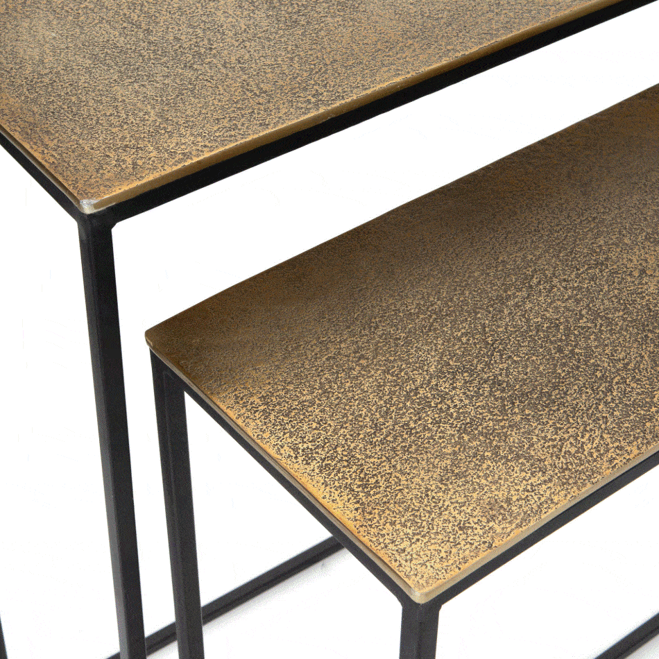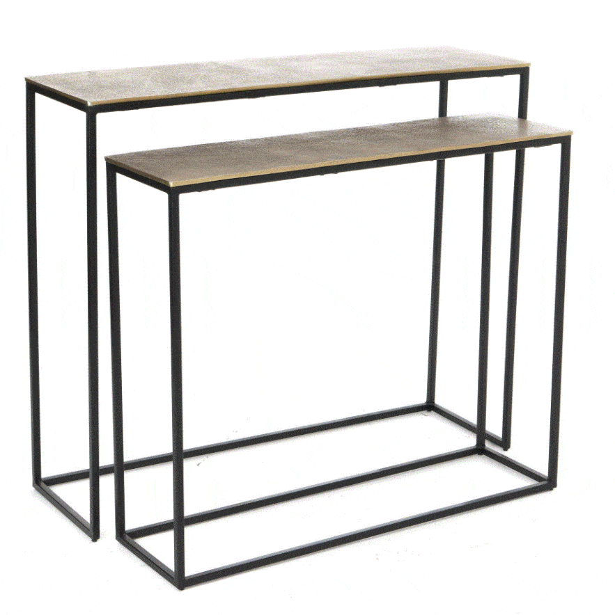 Consoles en fonte d’aluminium, finition dorée, aux dimensions complémentaires (PM : 25x90x75 cm, GM : 30x100x85 cm). Design épuré avec structure fine et plateau métallique, idéal pour enrichir une gamme de meubles d’appoint élégants et modernes. Léger et robuste, ce duo séduit par son aspect contemporain et sa polyvalence d’usage en intérieur.