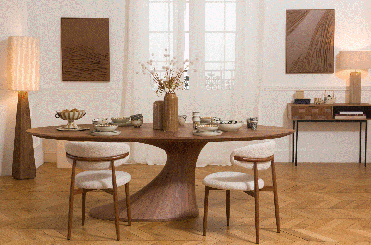 Table à manger au design contemporain, dotée d’un plateau et d’une base en placage de noyer. Ses dimensions généreuses (240 x 120 x 76 cm) en font un produit phare pour les espaces repas haut de gamme. Sa structure monobloc et son esthétique élégante valorisent toute offre mobilier moderne.
